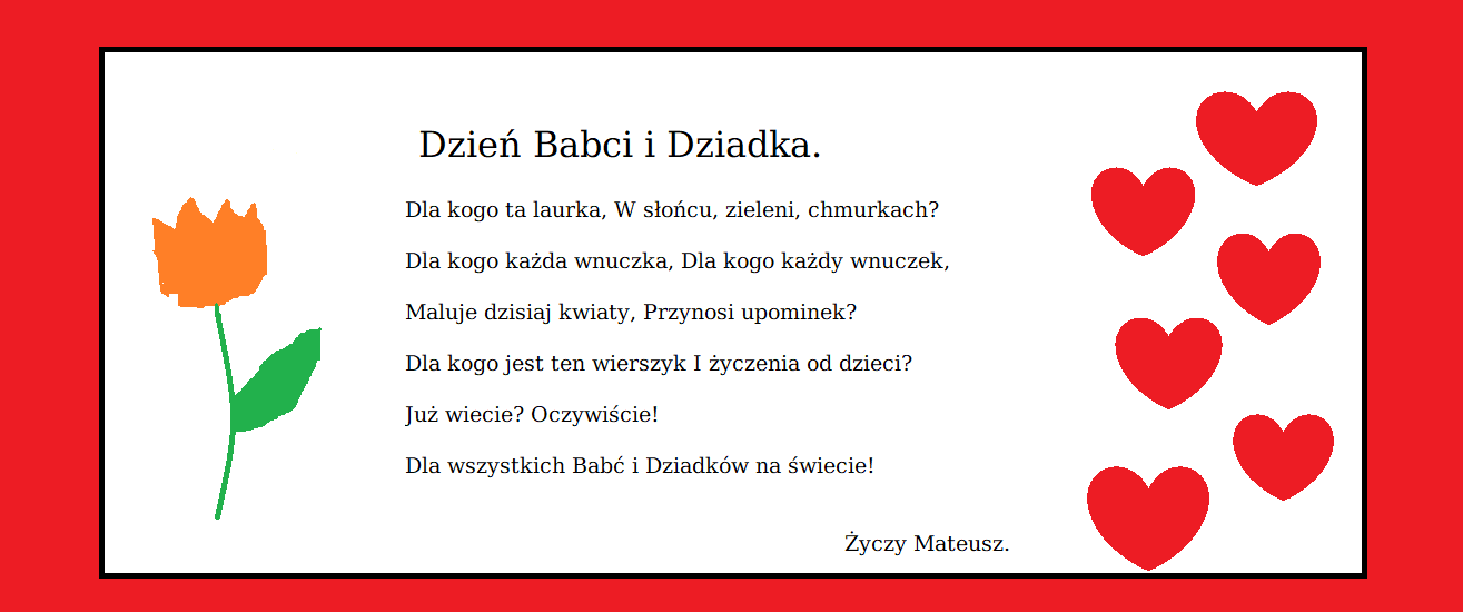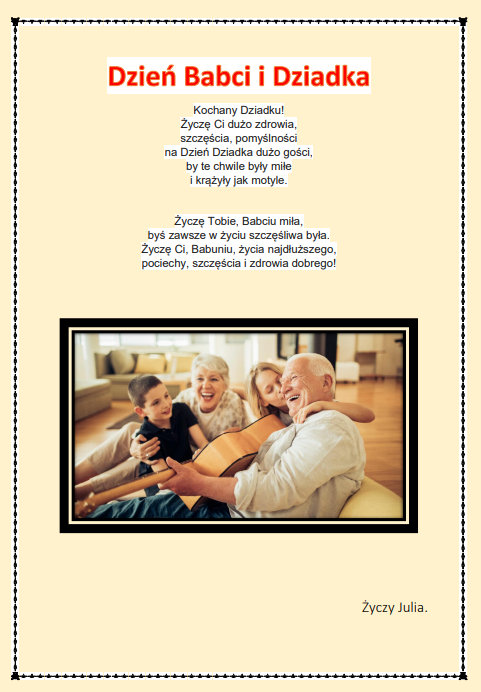 Uczniowie klas 4-8, w ramach lekcji informatyki, przygotowali kartki z okazji Dnia Babci i Dnia Dziadka. Agnieszka Wajda