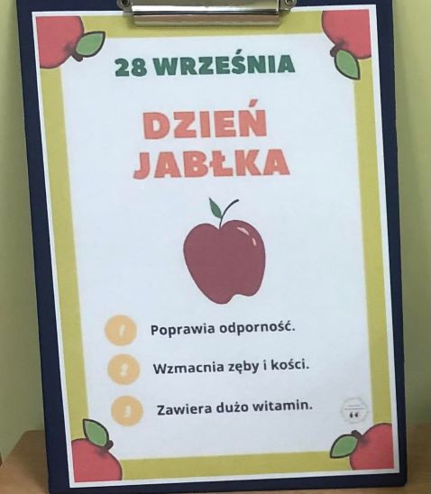28 września obchodziliśmy w naszej szkole oraz oddziale przedszkolnym Światowy Dzień Jabłka. Wszyscy w tym dniu zajadali się zdrowymi, soczystymi jabłuszkami ufundowanymi przez Radę Rodziców. Świętowanie tego dnia miało na celu promowanie zdrowego odżywiania się oraz zachęcanie do codziennego spożywania jabłek. Szczególnie w okresie jesieni warto zadbać o odporność. „Jedno jabłko dziennie trzyma lekarza z daleka ode mnie”. Sandra Góra