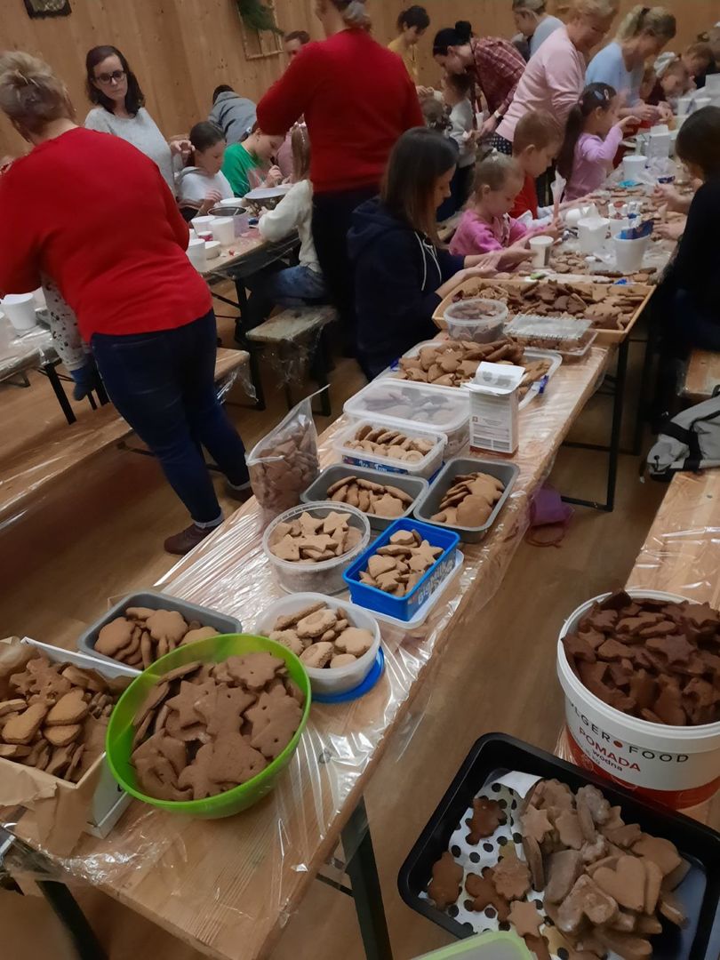Wielkie zaangażowanie pieczeniem pierników oraz ich ozdabianiem przez rodziców i uczniów zaowocowała przygotowaniem ponad 100 paczek świątecznych pierników, które później rozdane były przyjaciołom szkoły i sponsorom.