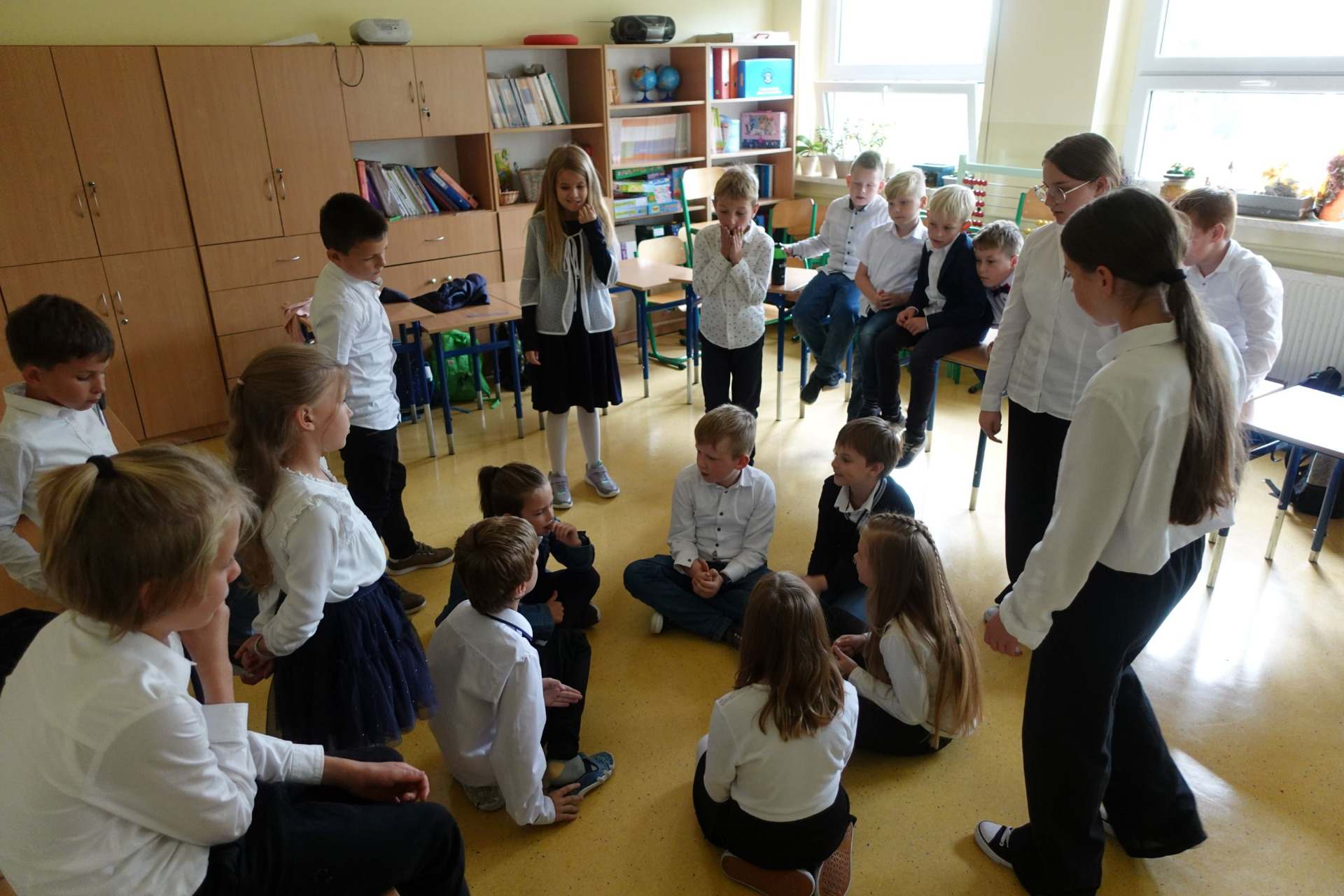 13 października 2023 r. obchodziliśmy w naszej szkole Dzień Edukacji Narodowej. Samorząd Uczniowski wraz z Dyrektorem Szkoły podziękowali wszystkim nauczycielom, pracownikom szkoły i przedszkola za trud włożony w nauczanie, wychowanie dzieci i młodzieży. Podczas apelu wyróżniono nauczycieli za pracę i wręczono pracownikom szkoły pamiątkowe dyplomy. Następnie uczniowie klasy VII pod opieką pedagoga szkolnego poprowadzili zajęcia integracyjne we wszystkich klasach. Obchody Dnia Edukacji Narodowej zostały przygotowane przez Samorząd Uczniowski, pod opieką pani Sandry Góra.