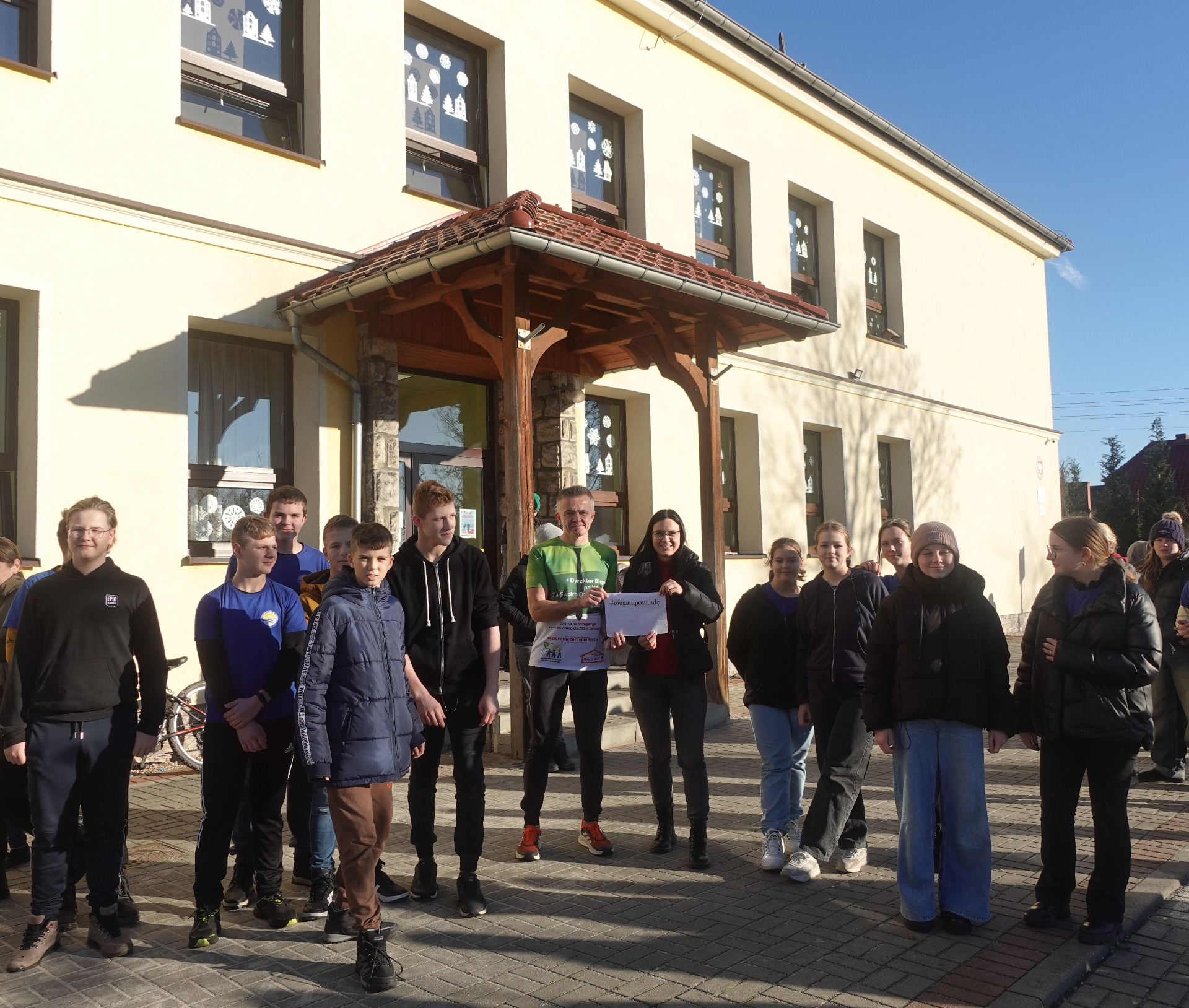 18 grudnia 2023 roku gościliśmy w naszej szkole Pana Artura Walkowiaka - dyrektora Zespołu Szkół Specjalnych w Zawadzkiem, który biegając zbiera pieniądze na windę potrzebną w swojej placówce. Uczniowie i pracownicy naszej szkoły po raz kolejny pokazali swoją bezinteresowną chęć pomocy.W ciągu tygodnia uzbieraliśmy ok. 1000 zł. Zwieńczeniem akcji był przyjazd Pana Artura do naszej szkoły. Przedstawicie Samorządu Uczniowskiego przekazali zebraną kwotę oraz piękny rysunek wykonany prze uczennicę Jasminę Rejek - Bryłka. Pan dyrektor przeprowadził rozgrzewkę, a następnie każda klasa przebiegła symboliczne okrążenie.