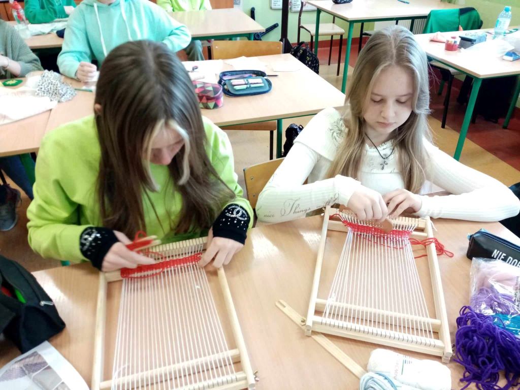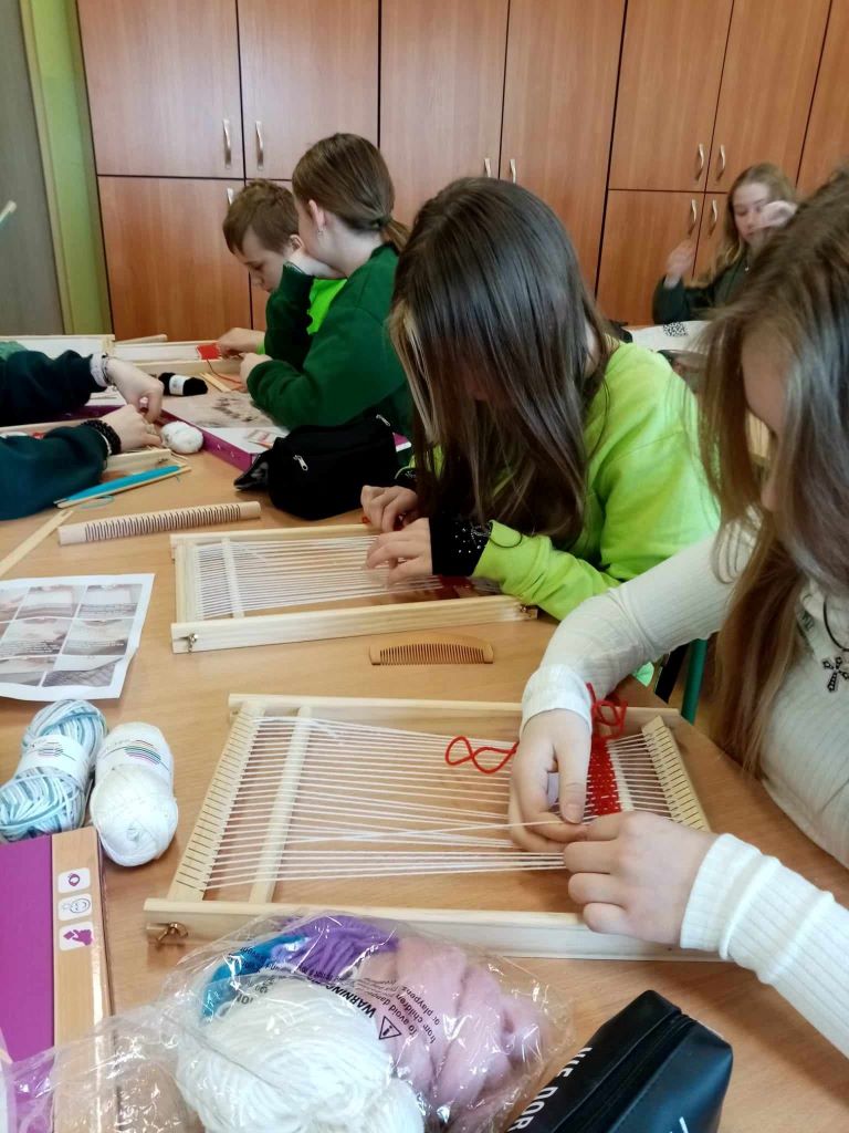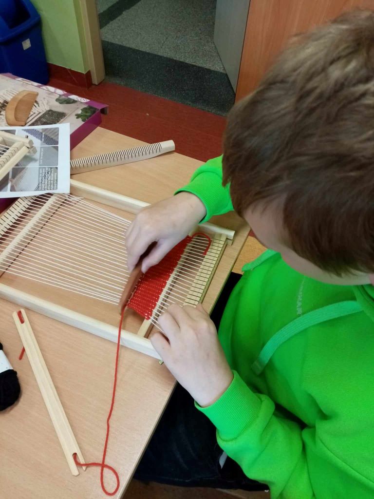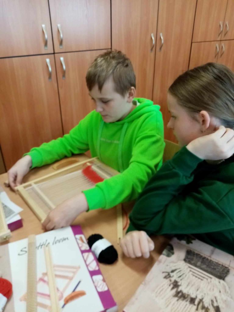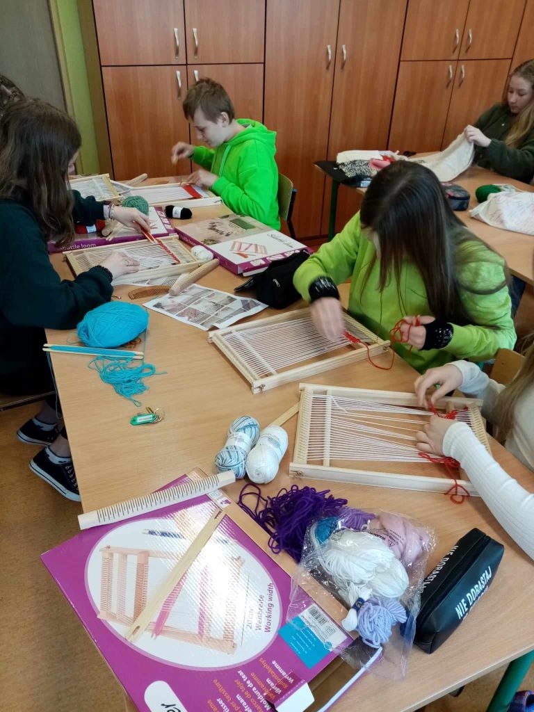 Na jednej z marcowych lekcji techniki uczniowie klasy 6 korzystali z zestawów kreatywnych - krosen, które otrzymaliśmy w ramach programu Laboratorium Przyszłości. Ćwicząc sprawność manualną uczniowie tworzyli dywaniki lub podkładki pod kubki, co im wyobraźnia podpowiadała. Zafascynowani swoimi efektami uczniowie postanowili kontynuować prace na krośnie na następnej lekcji. Cześć uczniów oprócz pracy na krośnie także szyła lub szydełkowała. Izabela Eichhorn