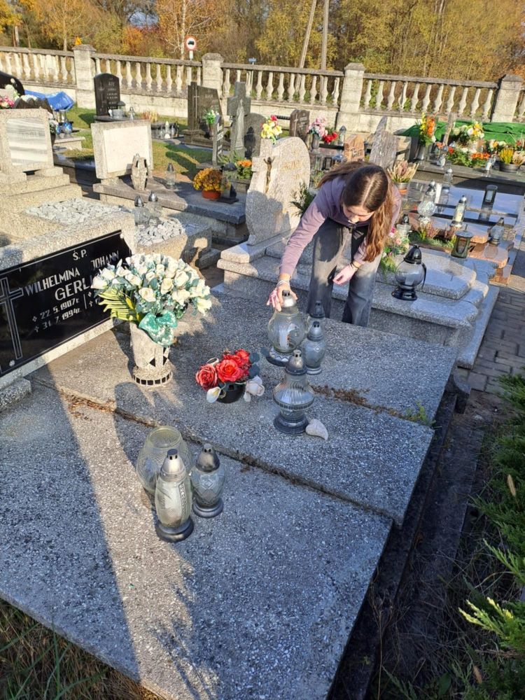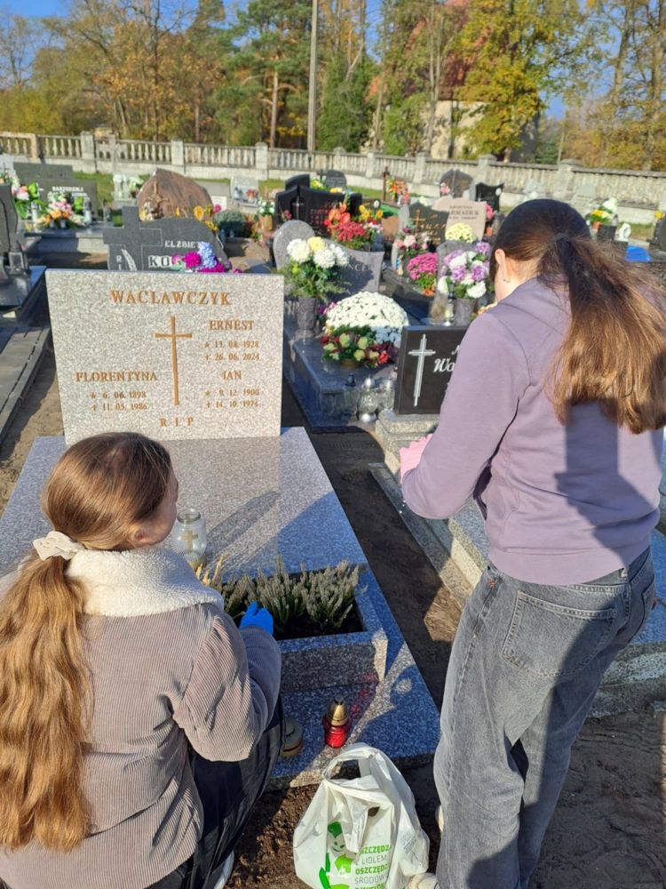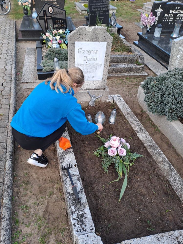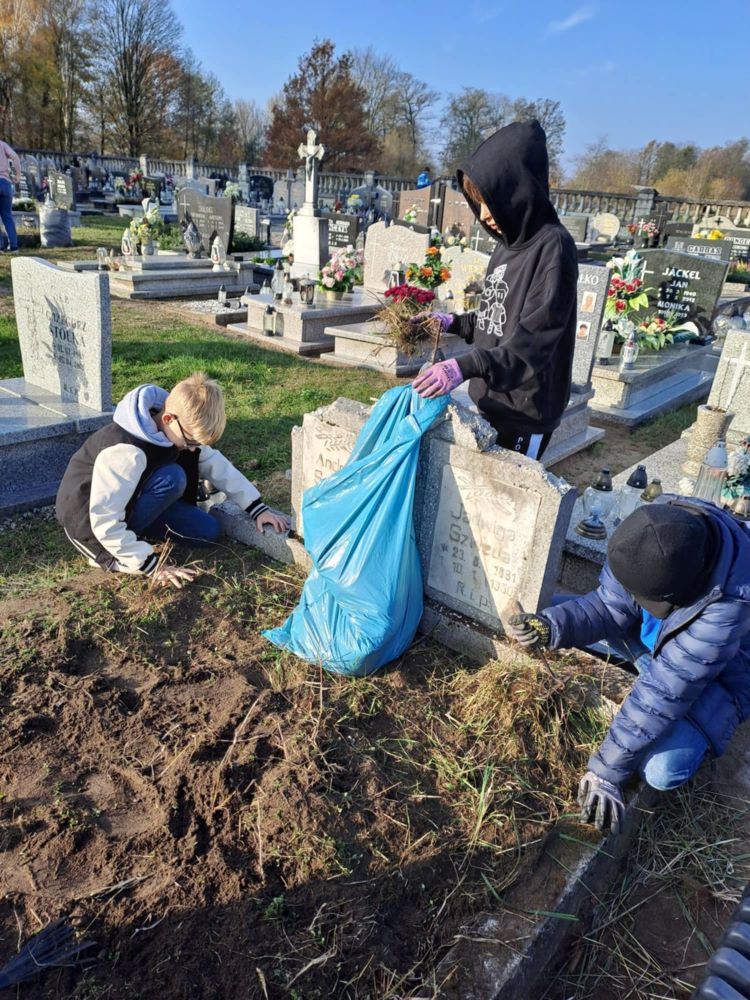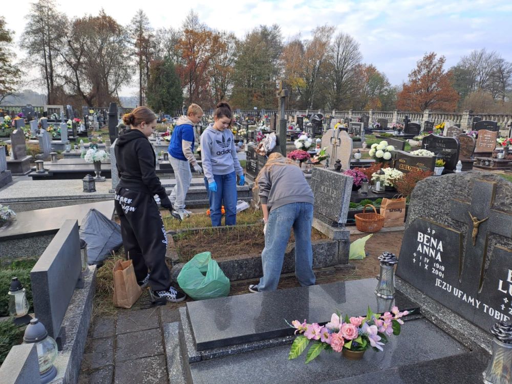 30 października 2024 roku wolontariusze razem z opiekunką panią Sandrą Kopera i panią Izabelą Eichhorn udali się na cmentarz. Naszym zadaniem było uprzątnąć zaniedbane, nieodwiedzane już przez nikogo groby, z okazji nadchodzącego święta Wszystkich Świętych. To cel edukacyjny, ale też pamięć o tych, którzy byli tu przed nami.
