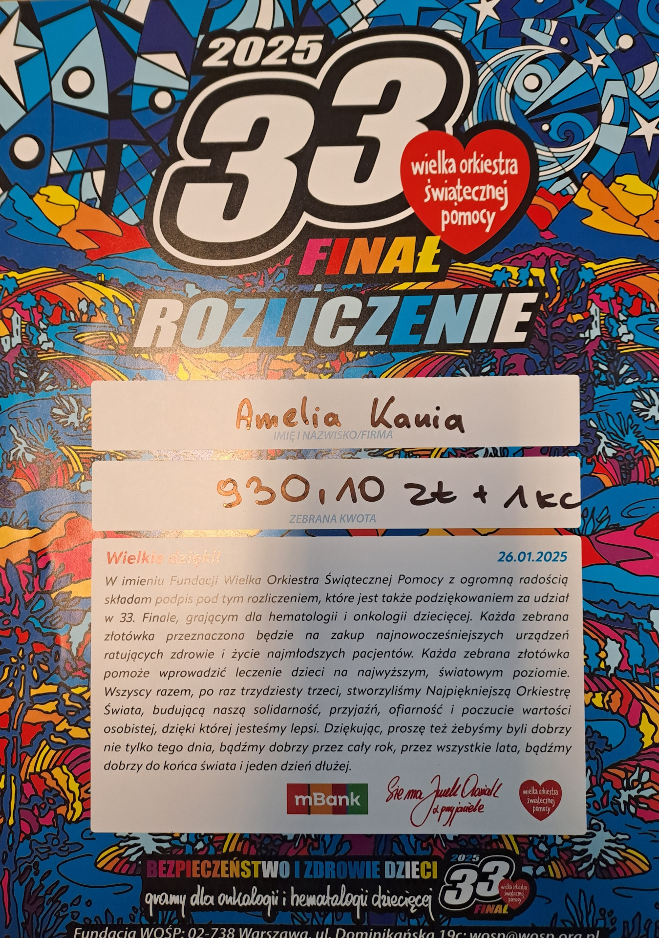 26 stycznia 2025 roku odbył się 33 Finał Wielkiej Orkiestry Świątecznej Pomocy, do którego przyłączyliśmy się, grając dla onkologii i hematologii dziecięcej. Nasi szkolni wolontariusze kwestowali przy kościele w Staniszczach Wielkich oraz sklepach w Kolonowskiem. Wspólnie zebraliśmy 3056,90 złotych, 20 euro i 1 koronę czeską.