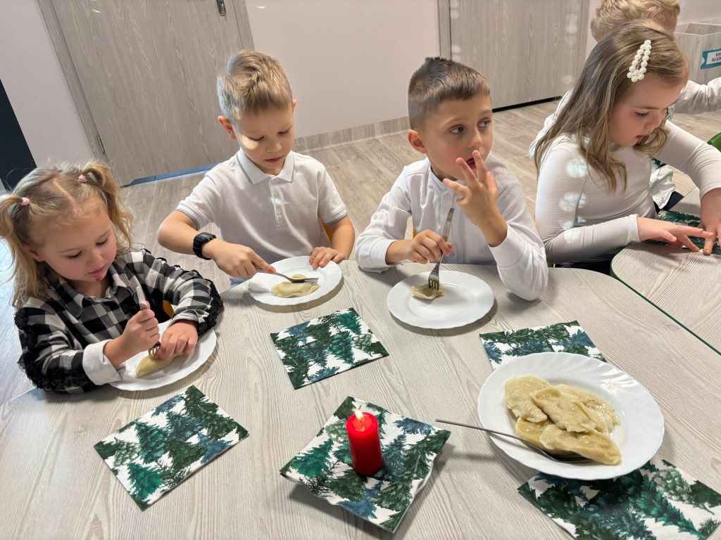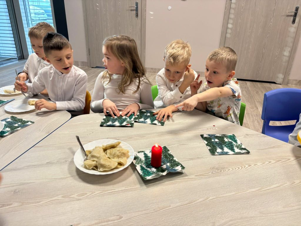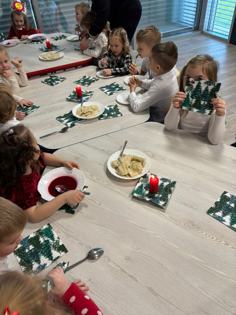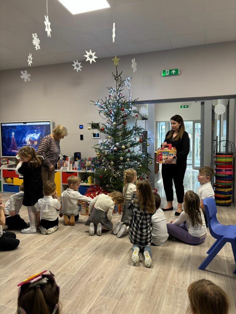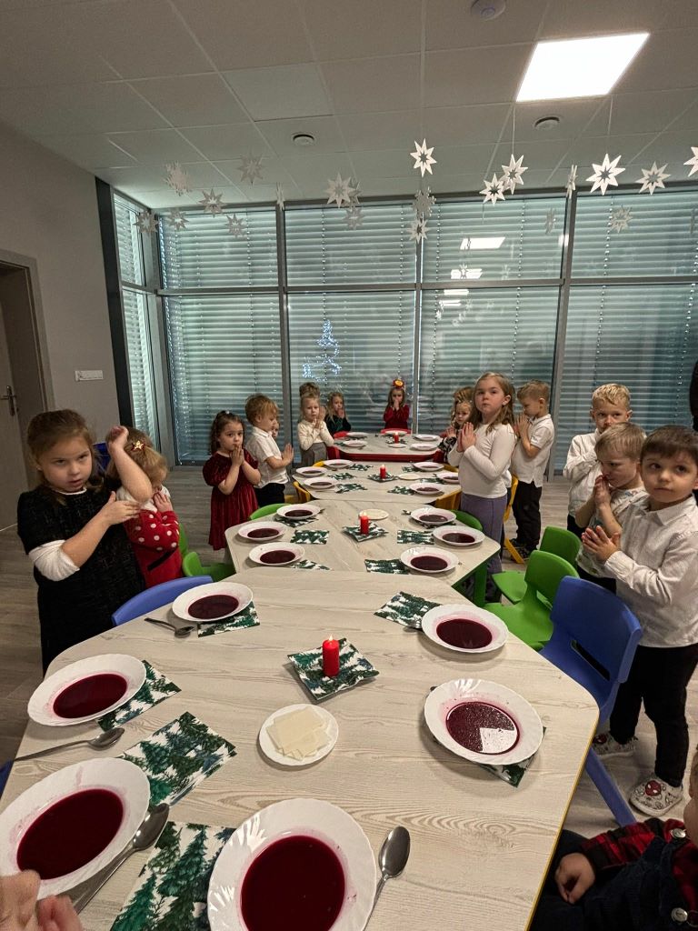 Wigilia w naszym przedszkolu była pełna ciepła, radości i świątecznej magii. Rozpoczęliśmy modlitwą i czytaniem Pisma Świętego o narodzeniu Jezusa, a potem dzieci dzieliły się opłatkiem, składając sobie serdeczne życzenia. Sala wypełniła się śpiewem kolęd i oczekiwaniem na „Dzieciątko” – moment, kiedy można było zobaczyć prezenty pod choinką.