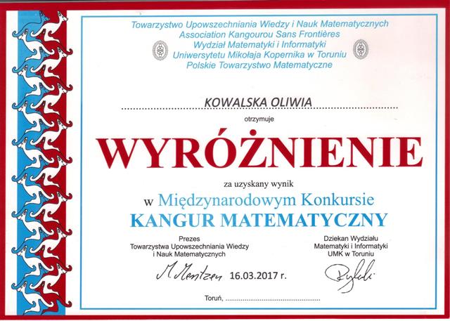 Uczennica Oliwia Kowalska oraz uczeń Jakub Dąbrowski otrzymali wyróżnienie za wynik uzyskany podczas Międzynarodowego Konkursu Kangur Matematyczny. Do udziału w konkursie zostali przygotowani przez panią Mieczysławę Perwejnis.