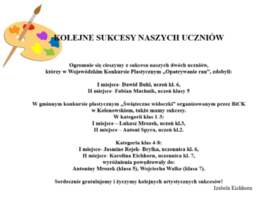 • Sukcesy uczniów w konkursach plastycznych: Wojewódzki Konkurs Plastyczny „Opatrywanie ran” oraz konkurs...