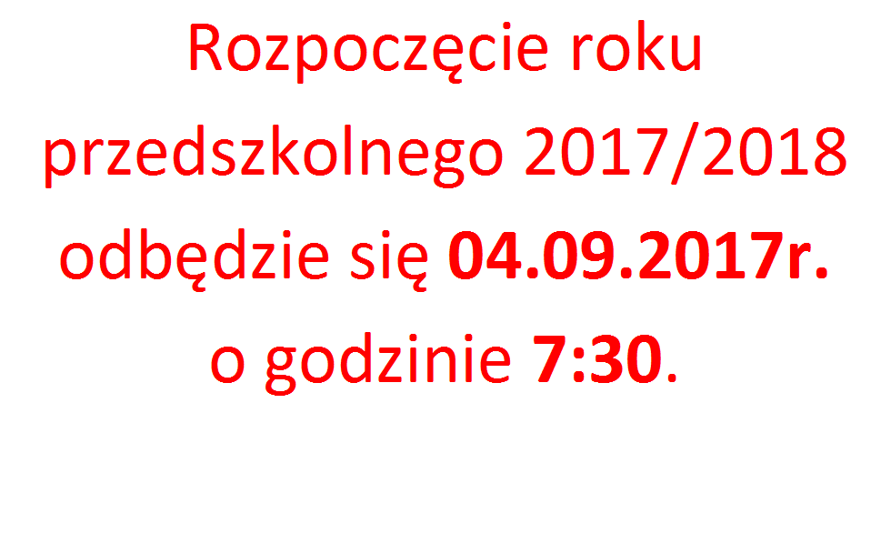 Rozpoczęcie roku przedszkolnego 2017/2018 odbędzie się 04.09.2017r. o godzinie 7:30.