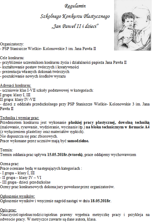 Regulamin Konkursu Plastycznego - "Jan Paweł II i dzieci" - załącznik