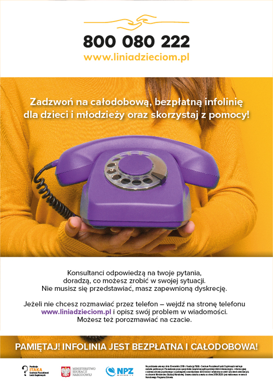 uprzejmie informuję, że dziś została uruchomiona całodobowa bezpłatna infolinia dla dzieci, młodzieży, rodziców i nauczycieli. Każda młoda osoba, która zechce porozmawiać o swoich problemach, może zadzwonić pod bezpłatny numer 800 080 222 i uzyskać pomoc od doświadczonych psychologów, pedagogów i prawników.
