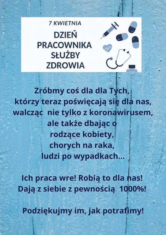 Serdecznie zapraszamy naszych uczniów do włączenia się w akcje #kartkadlamedyka ! Prace, zdjęcia, plakaty, wiersze, nagrania możecie przesyłać do 6 kwietnia do pedagoga szkolnego na adres mailowy: pedagog_sg@wp.pl. Wasze materiały zostaną przesłane do placówek medycznych dokładnie 7 kwietnia również pocztą mailową. Podziękujmy wspólnie Pracownikom Ochrony Zdrowia!