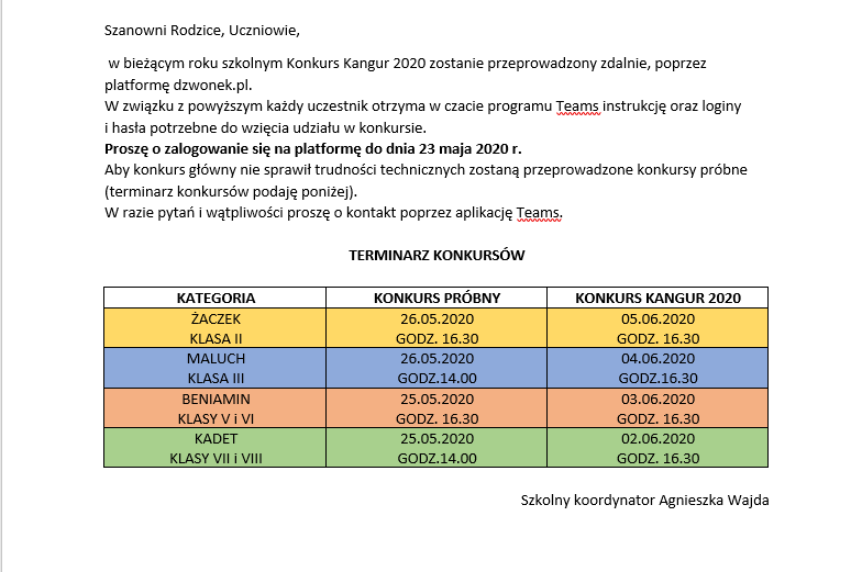 w bieżącym roku szkolnym Konkurs Kangur 2020 zostanie przeprowadzony zdalnie, poprzez platformę dzwonek.pl.