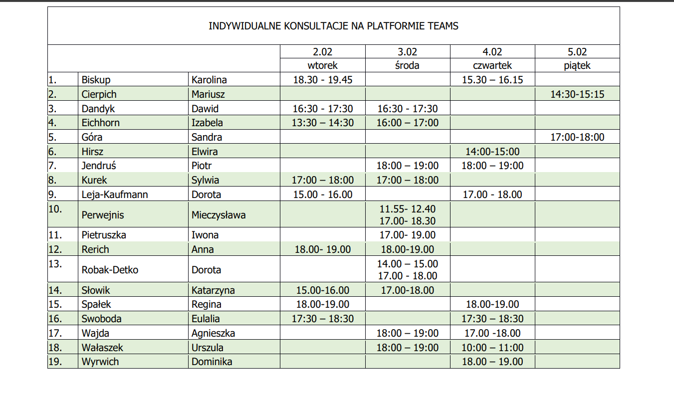Zapraszamy na indywidualne konsultacje na platformie Teams, w terminach podanych w tabeli.