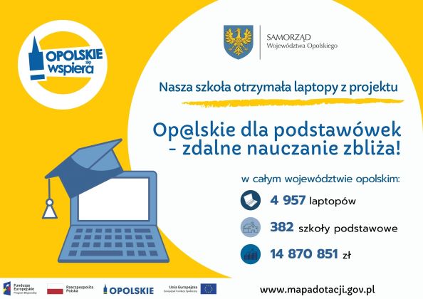 Informujemy, że w ramach projektu pn. „OP@LSKIE DLA PODSTAWÓWEK - zdalne nauczanie zbliża” nasza szkoła otrzymała 9 laptopów.
