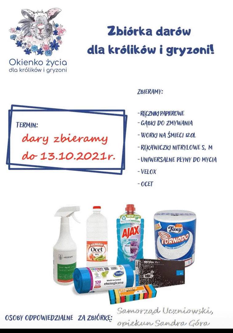 Dziś obchodzimy Międzynarodowy Dzień Zwierząt. Zastanówmy się zatem, czy nie możemy pomóc jakiemuś biednemu, poszkodowanemu przez los zwierzakowi… Z tej okazji NASZA SZKOŁA organizuje zbiórkę darów królików i innych gryzoni. W tym roku pomożemy Okienku życia dla królików i gryzoni w Lublińcu. Trafiają tam króliki, świnki morskie, szynszyle, chomiki, a nawet jeże. Dla gryzoni zbieramy głównie środki czystości tj. ręczniki papierowe, gąbki do zmywania, ocet, worki na śmieci, rękawiczki jednorazowe, uniwersalne płyny do mycia. Można również przynieść przysmaki, ziółka oraz inne pokarmy dla tych gryzoni. Zbiórka trwa do 13 października 2021r. Wymienione dary należy składać w głównym korytarzu naszej szkoły. Zapraszamy i zachęcamy wszystkich do pomocy.