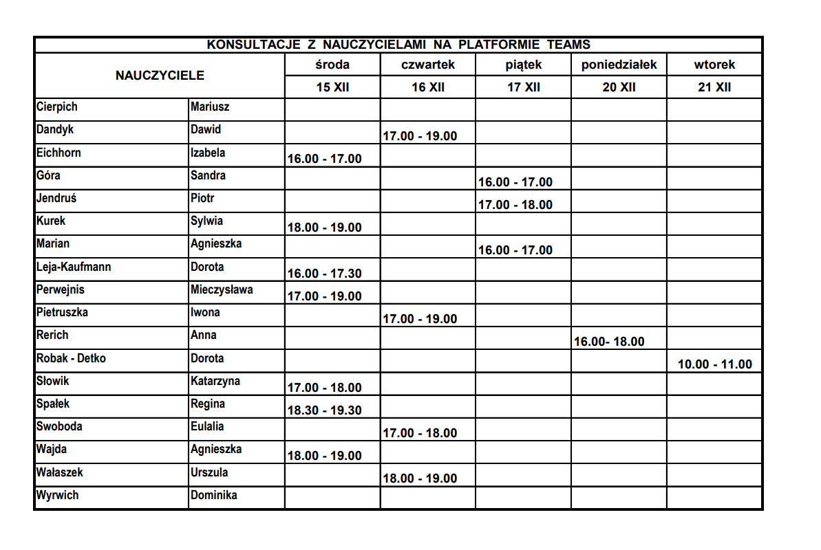 Terminy konsultacji z nauczycielami na platformie Teams.