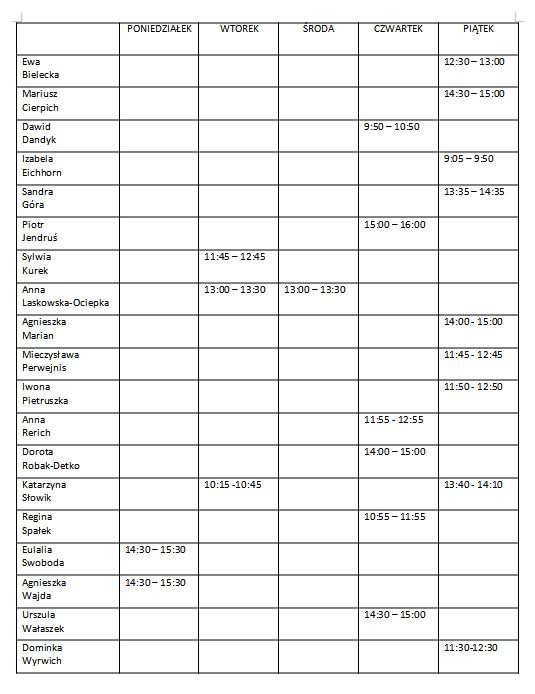 Informacja o godzinach konsultacji znajduje się w zakładce - Dokumenty szkolne.