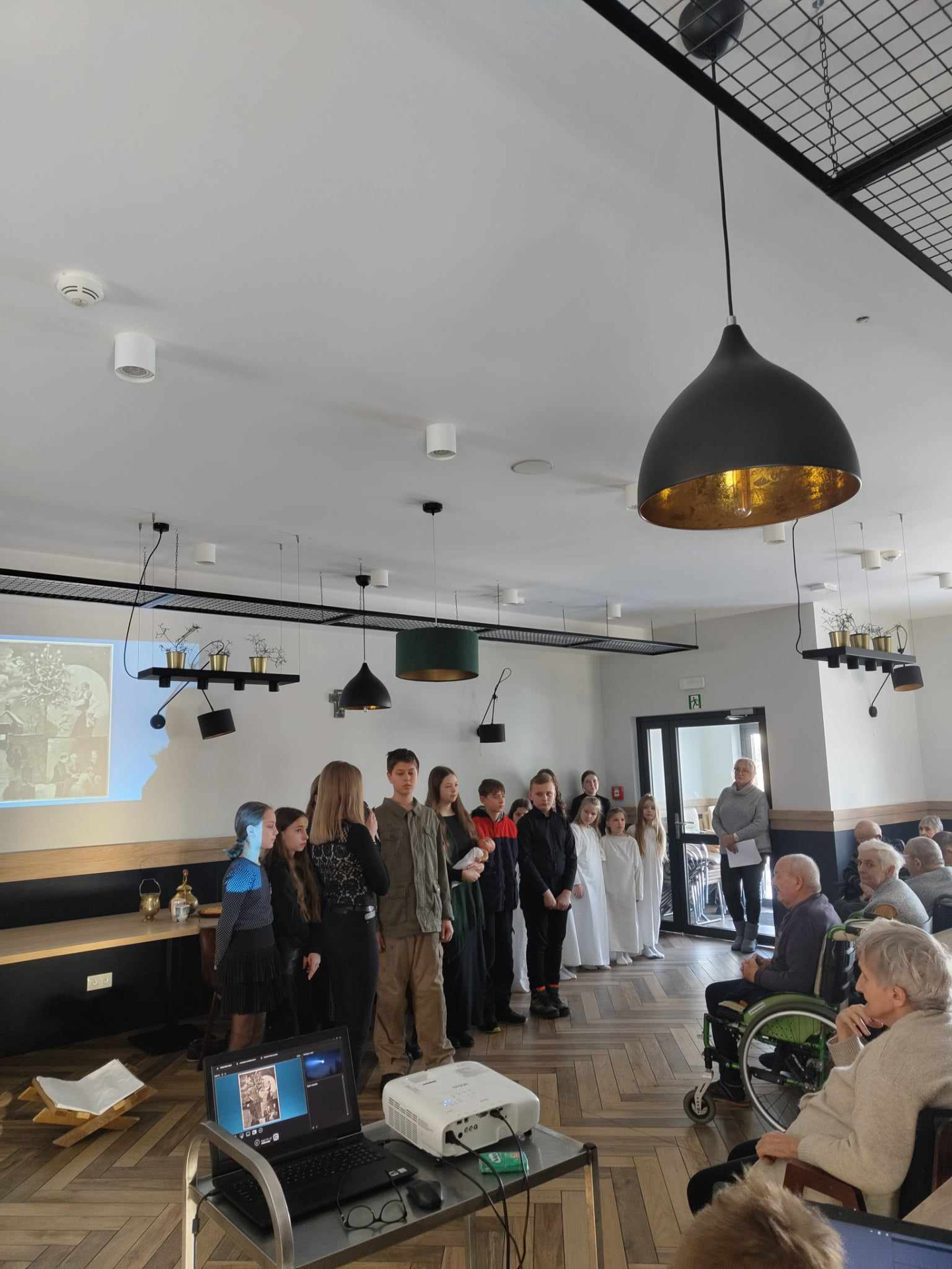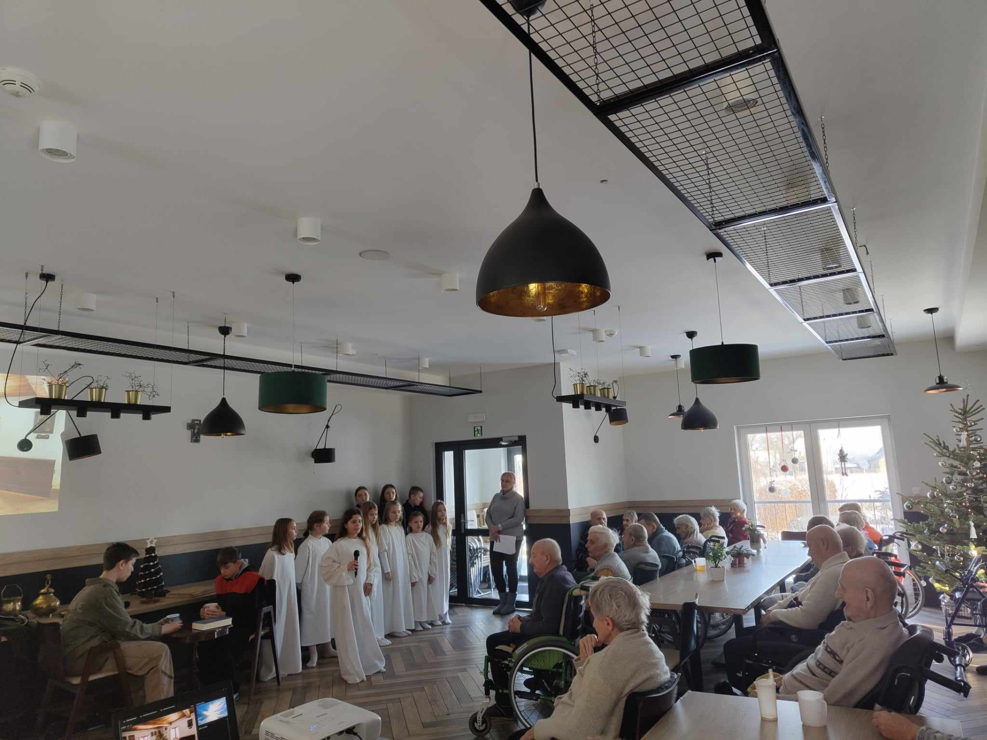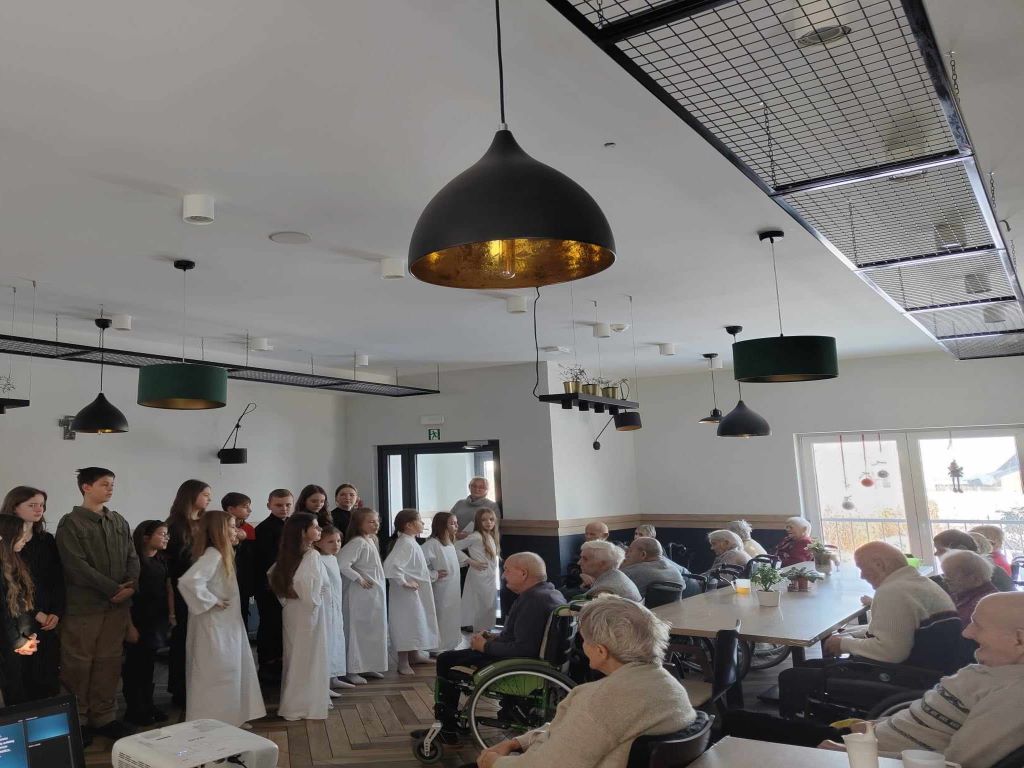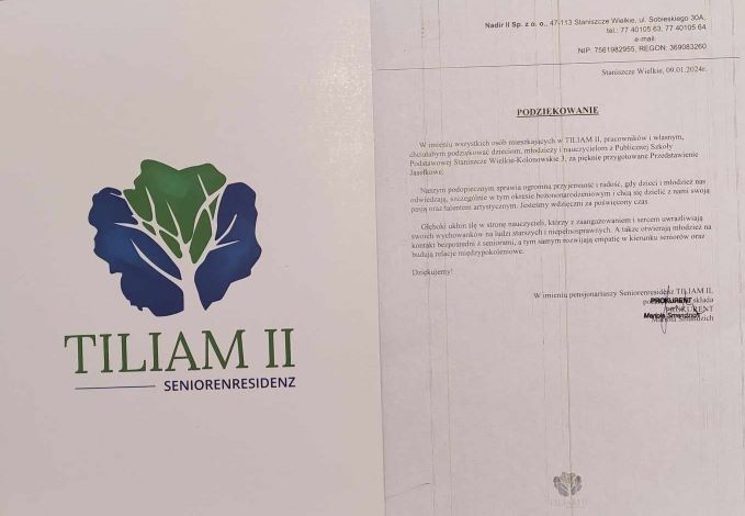 9 stycznia 2024 roku uczniowie szkolnego kółka teatralnego "Fraszka" oraz uczennice chóru młodszego, pod opieką pani Eulalii Swoboda, Katarzyny Słowik oraz Agnieszki Wajda, odwiedzili domy seniora - Siedlisko i Tiliam 2. Uczniowie przedstawili jasełka pod tytułem "Wigilia Marcina" oraz wręczyli podopiecznym kartki z okazji zbliżającego się Dnia Babci i Dziadka. Występ uczniów wywołał wielką radość i wzruszenie u pensjonariuszy. Bardzo dziękujemy pracownikom za serdeczne przyjęcie, a w szczególności dyrektorce domu seniora Tiliam 2, pani Smandzich i jej pracownikom.